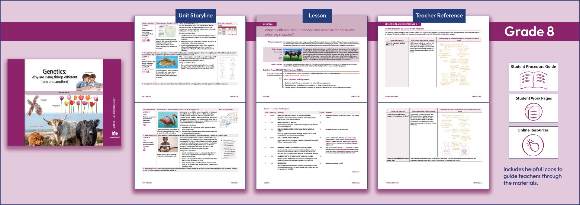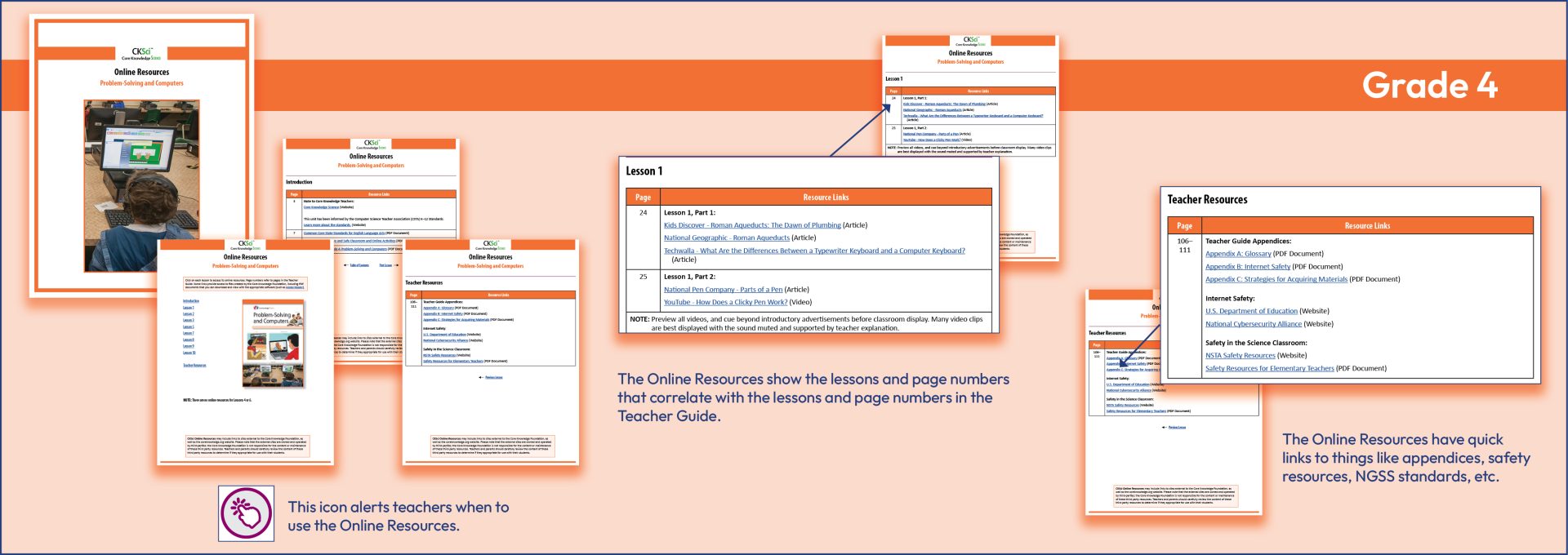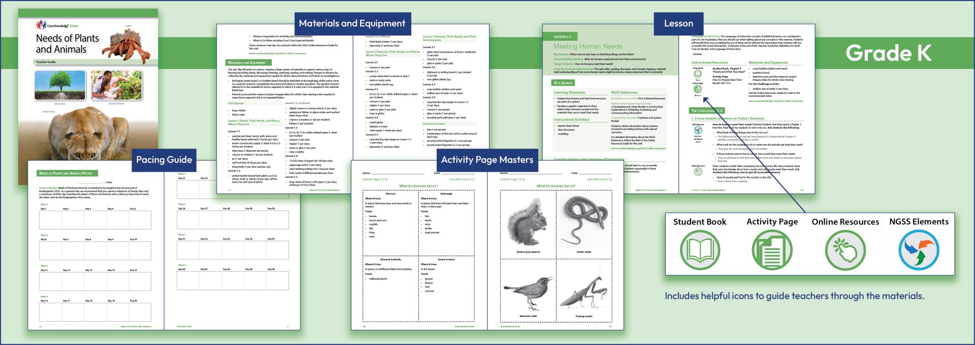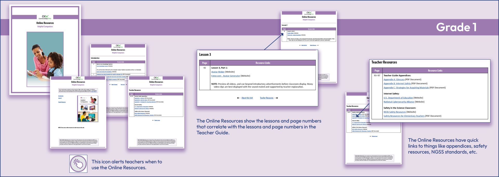 Core Knowledge Science (CKSci) provides a wealth of resources beyond those of the Teacher Guide, because each TG contains links to a bountiful wealth of resources that can be accessed online. Icons in the TG alert teachers to these resources, such as video connections, NGSS standards, material supply lists, pacing grids, resources for safe classrooms, and much more.