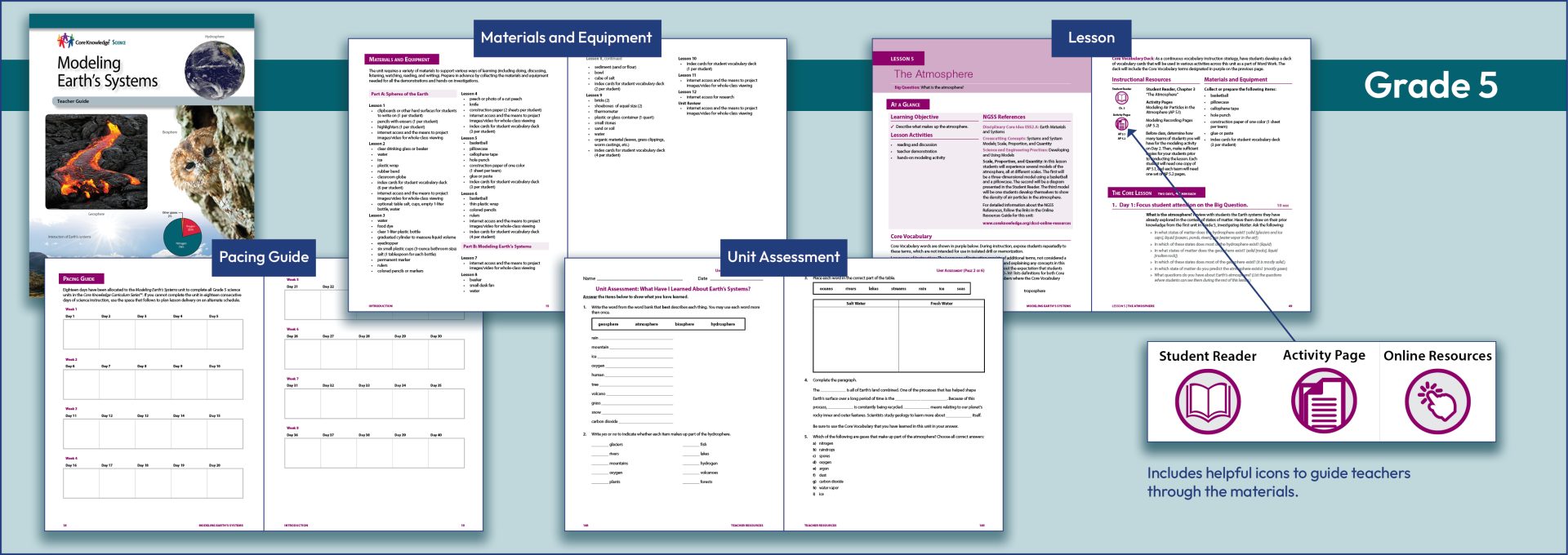 The Core Knowledge Teacher Guide contains icons to alert teacher to to a wealth of resources they can access online, such as video connections, NGSS standards, material supply lists, pacing grids, resources for safe classrooms, and much more. Each unit of study had a bountiful collection of superb resources.