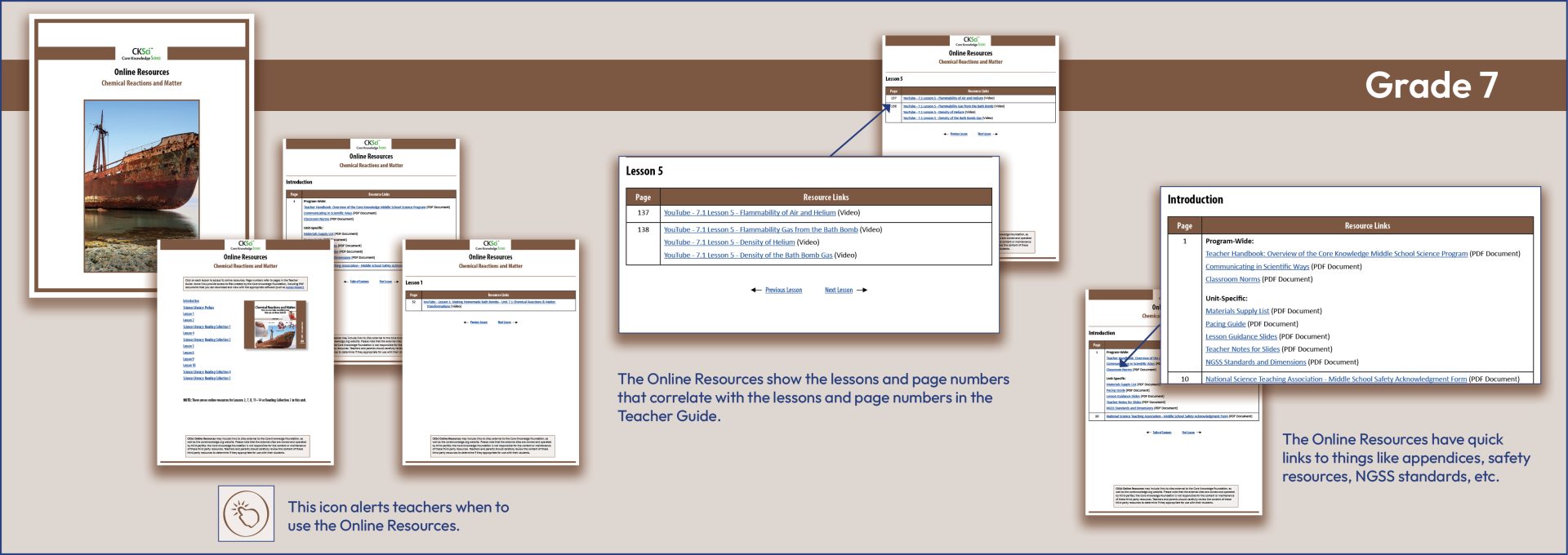 Core Knowledge Science provides a wealth of resources beyond those of the Teacher Guide, as each TG contains links to a bountiful wealth of resources that can be accessed online. Icons in the TG alert teachers to these resources, such as video connections, NGSS standards, material supply lists, pacing grids, resources for safe classrooms, and much more.