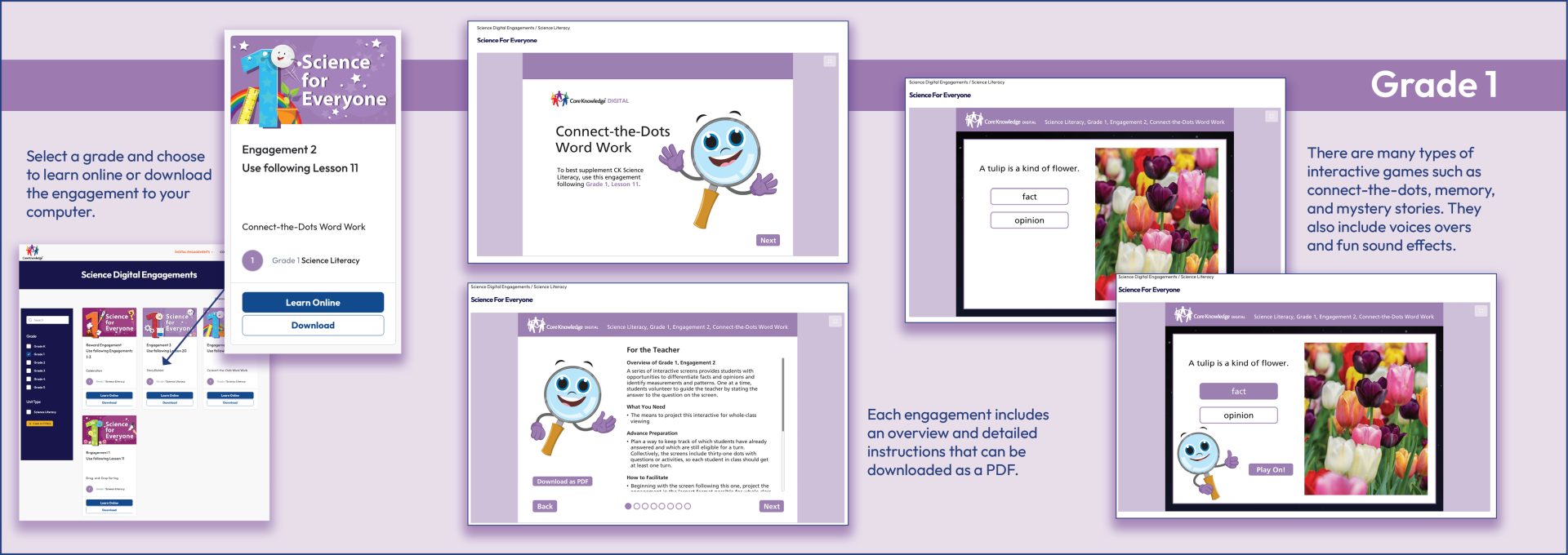 Each unit of the program is accompanied by an exciting component: CK Digital Engagements (DE). After a teacher completes a set number of lessons in a unit, the teacher can access the Digital Engagements from the Online Resources Guide. The teacher led, web-based interactive activities, are fun and instructive whole-class games/assessments. There are three DEs for every unit, and a final video reward for mastering each interactive. Each DE is about 10–15 minutes long. These games reinforce learning in a way the whole class will enjoy.